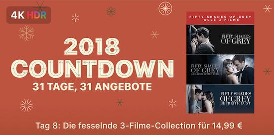 Das Weihnachtsfest rückt mal wieder näher und während sich bei manchen Freude und Besinnlichkeit breit macht, kommt bei anderen eher Hektik beim Weihnachtsshopping in den sich füllenden Fußgängerzonen und Shoppingzentren dieser Welt auf. Vor allem für Kinder bedeutet die Zeit bis zum Weihnachtsfest jeden Tag ein bisschen Freude beim Öffnen der Türen des Adventskalenders. Auch Apple bietet in diesem Jahr wieder eine Dezember-Aktion an und weitet diese gar auf 31 Tage, also bis zum Ende des Monats aus. Unter dem Motto "2018 Countdown - 31 Tage, 31 Angebote" wird man dabei jeden Tag einen neuen Inhalt aus dem Film-Bereich des iTunes Store zum Sonderpreis laden können. Heute erhält man auf diese Weise das Bundle Fifty Shades Trilogy mit allen drei Filmen der Reihe für nur € 14,99 in 4K HDR-Qualität zu Kaufen.