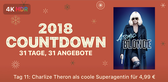 Das Weihnachtsfest rückt mal wieder näher und während sich bei manchen Freude und Besinnlichkeit breit macht, kommt bei anderen eher Hektik beim Weihnachtsshopping in den sich füllenden Fußgängerzonen und Shoppingzentren dieser Welt auf. Vor allem für Kinder bedeutet die Zeit bis zum Weihnachtsfest jeden Tag ein bisschen Freude beim Öffnen der Türen des Adventskalenders. Auch Apple bietet in diesem Jahr wieder eine Dezember-Aktion an und weitet diese gar auf 31 Tage, also bis zum Ende des Monats aus. Unter dem Motto "2018 Countdown - 31 Tage, 31 Angebote" wird man dabei jeden Tag einen neuen Inhalt aus dem Film-Bereich des iTunes Store zum Sonderpreis laden können. Heute erhält man auf diese Weise den Action-Kracher Atomic Blonde mit Charlize Theron für nur € 4,99 in 4K-HDR-Qualität zu Kaufen.