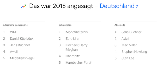 Und auch der Suchmaschinen-Gigant Google hat heute seine "Trends 2018" veröffentlicht, aus denen immer recht gut abzulesen ist, wofür sich Deutschland und der Rest der Welt in den zurückliegenden 12 Monaten interessiert hat. Dabei standen hierzulande bei dem allgemeinen Suchbegriffen vor allem die WM, Daniel Küblböck, Jens Büchner, Avicii und der Begriff "Medaillenspiegel" im Fokus. Bei den Schlagzeilen sorgten die Mondfinsternis, Euro Lira, die royale Hochzeit von Prinz Harry, Chemnitz und der Hambacher Forst für ein erhöhtes Aufkommen von Suchanfragen. Für die weiteren Kategorien empfehle ich einen Abstecher zu Googles Jahresrückblick.