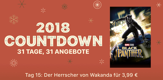 Das Weihnachtsfest rückt mal wieder näher und während sich bei manchen Freude und Besinnlichkeit breit macht, kommt bei anderen eher Hektik beim Weihnachtsshopping in den sich füllenden Fußgängerzonen und Shoppingzentren dieser Welt auf. Vor allem für Kinder bedeutet die Zeit bis zum Weihnachtsfest jeden Tag ein bisschen Freude beim Öffnen der Türen des Adventskalenders. Auch Apple bietet in diesem Jahr wieder eine Dezember-Aktion an und weitet diese gar auf 31 Tage, also bis zum Ende des Monats aus. Unter dem Motto "2018 Countdown - 31 Tage, 31 Angebote" wird man dabei jeden Tag einen neuen Inhalt aus dem Film-Bereich des iTunes Store zum Sonderpreis laden können. Heute erhält man auf diese Weise den Superhelden-Action-Kracher Black Panther für nur € 3,99 in HD-Qualität zu Kaufen.