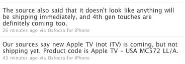 UPDATE, 01.09.2010, 15:45 Uhr: Kurz vor Beginn des heutigen Events will die australische Macworld folgende Details erfahren haben und veröffentlicht sie per Twitter. Sowohl die vierte Generation des iPod touch, als auch das neue Apple TV (der Name soll wohl doch beibehalten werden) werden heute vorgestellt, sollen aber nicht unmittelbar in den Verkauf gehen. Hier stellt sich lediglich die Frage, ob sich dies nur auf den australischen Markt, oder international bezieht. Evtl. verzögert sich die Verfügbarkeit für alle heute Abend vorgestellten Produkte tatsächlich, da Apples diesjährige Back-to-School Promotion noch bis kommende Woche läuft und man in Cupertino in den vergangenen Jahren erst nach dieser Aktion seine neuen iPods in den Verkauf brachte. Möglich ist aber auch, dass man sie nun schon eine Woche vorher bringt, um so quasi noch einmal einen Endspurt für die Promotion zu pushen. In wenigen Stunden wissen wir mehr... (via 9to5Mac)