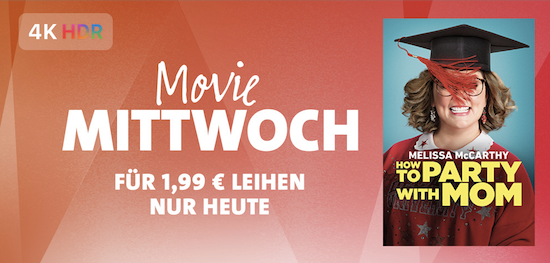 Auch heute hat Apple wieder den sogenannten "Movie Mittwoch" ausgerufen. Dabei wird jeden Mittwoch ein ausgewählter Film aus dem iTunes-Sortiment für 24 Stunden zum Sonderpreis von nur € 1,99 in 4K HD-Qualität zum Leihen angeboten. Heute erhält man dabei die abgefahrene Komödie How to Party with Mom mit Melissa McCarthy. Nachdem man den Leih-Film geladen hat, kann er innerhalb von 30 Tagen angeschauen werden. Wie immer bei geliehenen Filmen aus dem iTunes Store gilt: Hat man hiermit einmal begonnen, muss man ihn innerhalb von 48 Stunden beenden.
