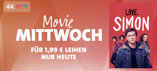 Auch heute hat Apple wieder den sogenannten "Movie Mittwoch" ausgerufen. Dabei wird jeden Mittwoch ein ausgewählter Film aus dem iTunes-Sortiment für 24 Stunden zum Sonderpreis von nur € 1,99 in 4K HD-Qualität zum Leihen angeboten. Heute erhält man dabei die Liebes-Komödie Love, Simon mit Jennifer Garner. Nachdem man den Leih-Film geladen hat, kann er innerhalb von 30 Tagen angeschauen werden. Wie immer bei geliehenen Filmen aus dem iTunes Store gilt: Hat man hiermit einmal begonnen, muss man ihn innerhalb von 48 Stunden beenden.