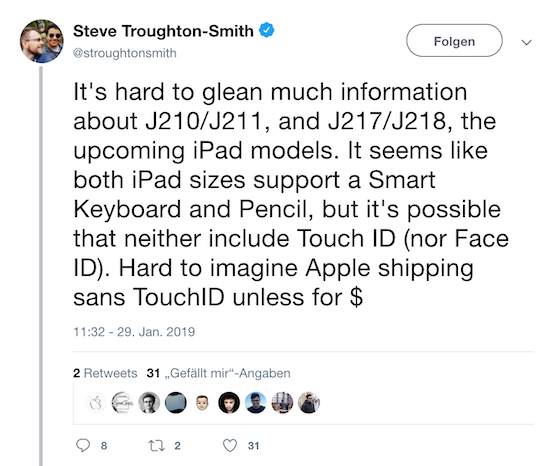 Inzwischen deutet immer mehr darauf hin, dass Apple in diesem Frühjahr neben einem neuen günstigen Einstiegs-iPad auch ein neues iPad mini auf den Markt bringen wird. Und wenn es gut läuft, könnte Apple diese beiden neuen iPads auch mit Unterstützung für den Apple Pencil und das Smart Keyboard ausstatten, wie der Entwickler Steve Troughton-Smith herausgefunden hat. In den Tiefen der aktuellen Beta von iOS 12.2 fand er weitere Hinweise auf die neuen iPad-Modelle mit den internen Bezeichnungen J210, J211, J217 und J218 , wobei beiden neuen Geräte in jeweils zwei Größen kommen dürften. Bereits beim aktuellen 9,7"-iPad hatte Apple die Unterstützung für die Vorgänger-Generation des Apple Pencil integriert. Dies dürfte sich laut Troughton-Smith nun fortsetzen und auch auf das iPad mini 5 zutreffen. Nicht kommen dürfte in diesem Jahr hingegen Face ID bei den günstigen iPads, die wohl weiter auf den Fingerabdrucksensor und damit Touch ID setzen werden.
