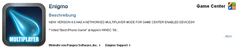 Neben den neuen Ping-Funktionen hat Apple auch eine Kleinigkeit im AppStore verändert, die es zukünftig einfacher macht, Spiele zu identifizieren, die mit dem GameCenter kompatibel sind. Hierzu wird künftig auf der jeweiligen Seite der App oben rechts ein Banner eingeblendet, der die GameCenter-Kompatibilität signalisiert. Dieses "Feature" ist übrigens nicht auf iTunes 10.0.1 beschränkt, sondern findet sich auch im AppStore älterer iTunes-Versionen.