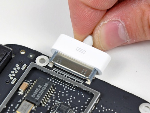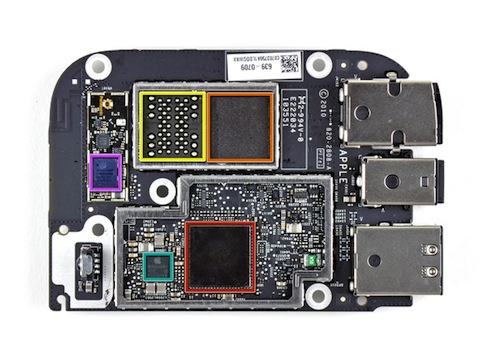 iFixit. Dabei wurden einige durchaus interessante Details zu Tage gefördert. So bietet das Gerät einen internen Flash-Speicherplatz von 8 GB, was bei einem rein auf Streaming ausgelegten Gerät durchaus als großzügig zu bezeichnen ist und Platz für erneute Spekulationen bietet. Ein Teil davon wird aber in jedem Fall schon einmal vom Betriebssystem belegt. Ansonsten gleichen viele der inneren Komponenten denen des aktuellen iPad. So findet man unter anderem wie zu erwarten den Apple A4-Prozessor, 256 MB Arbeitsspeicher und den Bluetooth-/WLAN-Chipsatz BCM4329 von Broadcom reichen. Apple hätte also rein theoretisch auch die Möglichkeit, Bluetooth auf dem Apple TV zu aktivieren. Neben dem verbauten Flash-Baustein bietet das Apple TV übrigens einen weiteren, unbelegten Platz für eine eventuelle spätere Aufstockung des selbigen. Zudem entdeckte man bei iFixit auffällige Lötstellen auf dem Board, die ziemlich genau auf Apples proprietären Dock-Anschluss