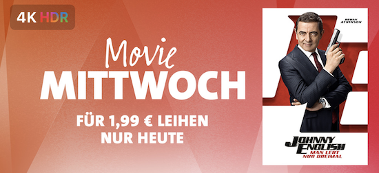 Auch heute hat Apple wieder den sogenannten "Movie Mittwoch" ausgerufen. Dabei wird jeden Mittwoch ein ausgewählter Film aus dem iTunes-Sortiment für 24 Stunden zum Sonderpreis von nur € 1,99 in 4K HDR-Qualität zum Leihen angeboten. Heute erhält man dabei die Agenten-Komödie Johnny English: Man lebt nur dreimal mit "Mister Bean" Rowan Atkinson. Nachdem man den Leih-Film geladen hat, kann er innerhalb von 30 Tagen angeschauen werden. Wie immer bei geliehenen Filmen aus dem iTunes Store gilt: Hat man hiermit einmal begonnen, muss man ihn innerhalb von 48 Stunden beenden.