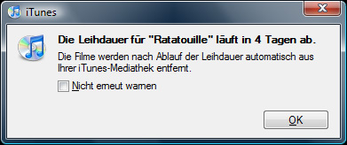 Leihmodells für Filme über den iTunes Store. Nach meinen Erfahrungen funktioniert das Modell einwandfrei. Die Filme laden sehr schnell und die Wiedergabe und das Übertragen auf iPod und iPhone klappen problemlos. Heute bekam ich beim Starten von iTunes eine Warnung angezeigt, die mich darauf hinwies, dass ich vielleicht doch langsam mal anfangen sollte, mir den ausgeliehenen "Ratatouille" anzuschauen, da er sonst in vier Tagen von meinem Rechner gelöscht wird. Auch dies ist, wie ich finde eine gute und gelungene Einrichtung. Den Screenshot gibt's im Anschluss.
