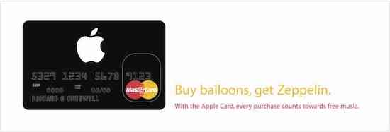 Seinerzeit waren vor allem der iPod und der iTunes Store Apples große Zugpferde, weswegen Ausgaben mit der Kreditkarte den damaligen Plänen zufolge auch mit kostenloser Musik belohnt werden sollten. Verrechnet werden sollten die Ausgaben dann mit sogenannten "iPoints", die sich dann wiederum im iTunes Store einlösen lassen sollten. Segall liefert in seinem Blog auch gleich noch verschiedene Werbe-Ideen, die man bereits geschmidet hatte. Die Slogans spielten dabei stets mit einer Kombination aus Konsumgütern und Bandnamen, wie beispielsweise "Buy balloons, get Zeppelin" oder "Buy lipstick, get Kiss". Auch damals sollte die Karte bereits "Apple Card" heißen.