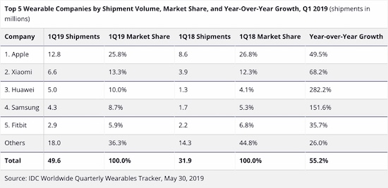 Während das iPhone zuletzt ein wenig schwächelte, taten soch vor allem die Service-Sparte und der Bereich der Wearables und Gadgets, zu denen unter anderem auch die Apple Watch zählt positiv hervor. Die Analysten von IDC haben nun aktuelle Zahlen veröffentlicht, die dies noch einmal verdeutlichen. Demnach hat Apple im ersten Quartal 2019 12,8 Millionen Wearables weltweit an den Mann gebracht. Neben der Apple Watch werden hierzu auch die AirPods und ausgewählte Beats-Kopfhörer gezählt. Damit kommt Apple auf einen Marktanteil von 25,8%, also etwas mehr als ein Viertel. Damit ist man das Wearables-Unternehmen Nummer eins auf der Welt. Und das Wachstum sieht auch weiterhin bestens für Cupertino aus. Im Jahresvergleich konnte Apple hier um knapp 50% zulegen. Apples chinesische Konkurrenten Xiaomi und Huawei folgen bereits mit einem Respektsabstand von 6,6 bzw. 5 Millionen verkauften Geräten auf den Plätzen zwei und drei.
