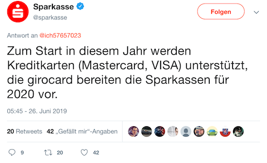 Seit gestern ist bekannt, dass sich hierzulande nun endlich auch die Sparkassen und die Volks- und Raiffeisenbanken dazu durchgerungen haben, Apple Pay seinen Kunden noch in diesem Jahr anzubieten. Unklar war bislang jedoch, ob damit einhergehend ab dem Herbst auch die hierzulande weitverbreiteten Girocards dabei unterstützt werden. Dies hat die Sparkasse heute nun via Twitter aufgeklärt. Demnach wird Apple Pay bei den beiden größten deutschen Kreditinstituten in diesem Jahr zunächst ausschließlich mit Kreditkarten von Mastercard und VISA funktionieren. Ab dem kommenden Jahr sollen dann aber auch Girocards unterstützt werden.