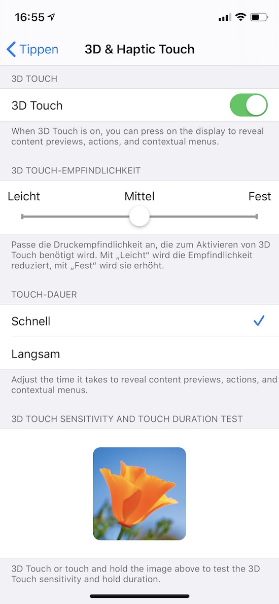Mit der am Montagabend ausgegebenen neuen Beta von iOS 13 und iPadOS 13 treibt Apple nun die Umstellung von 3D Touch auf Haptic Touch weiter voran und hat in den Geräteeinstellungen unter "Bedienungshilfen > Tippen" einen neuen Menüpunkt eingeführt, der auf den Namen "3D & Haptic Touch" hört und in dem man unter anderem sowohl über einen Schieberegler die 3D Touch-Empfindlichkeit, als auch über eine einfache Auswahl die Touch-Dauer für Haptic Touch festlegen kann.