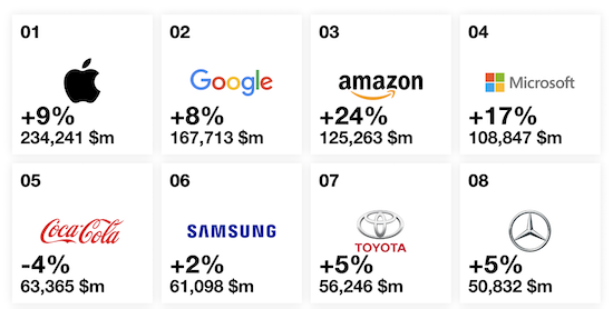 Apple ist seit 2013 auf Platz 1, Google seitdem auf Platz 2. Amazon hat sich hoch gekämpft, aber die Top 8 2018 unterscheiden sich nicht von 2019.