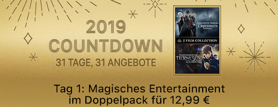 Das Weihnachtsfest rückt mal wieder näher und während sich bei manchen Freude und Besinnlichkeit breit macht, kommt bei anderen eher Hektik beim Weihnachtsshopping in den sich füllenden Fußgängerzonen und Shoppingzentren dieser Welt auf. Vor allem für Kinder bedeutet die Zeit bis zum Weihnachtsfest jeden Tag ein bisschen Freude beim Öffnen der Türen des Adventskalenders. Auch Apple bietet in diesem Jahr wieder eine Dezember-Aktion an und weitet diese gar auf 31 Tage, also bis zum Ende des Monats aus. Unter dem Motto "2019 Countdown - 31 Tage, 31 Angebote" wird man dabei jeden Tag einen neuen Inhalt aus dem Film-Bereich des iTunes Store zum Sonderpreis laden können. Heute erhält man auf diese Weise das Bundle Phantastische Tierwesen 1&2 für nur € 12,99 in 4K HDR Qualität zu Kaufen.