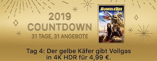 Das Weihnachtsfest rückt mal wieder näher und während sich bei manchen Freude und Besinnlichkeit breit macht, kommt bei anderen eher Hektik beim Weihnachtsshopping auf. Vor allem für Kinder bedeutet die Zeit bis zum Weihnachtsfest jeden Tag ein bisschen Freude beim Öffnen der Türen des Adventskalenders. Auch Apple bietet in diesem Jahr wieder eine Dezember-Aktion an und weitet diese gar auf 31 Tage, also bis zum Ende des Monats aus. Unter dem Motto "2019 Countdown - 31 Tage, 31 Angebote" wird man dabei jeden Tag mit einem neuen Inhalt aus dem Film-Bereich des iTunes Store zum Sonderpreis beschenkt. Heute erhält man auf diese Weise den Transformers-Blockbuster Bumblebee für nur € 4,99 in 4K HDR Qualität zu kaufen.