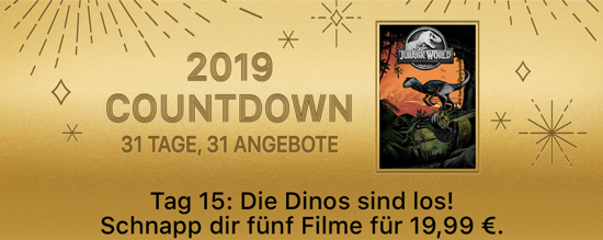 Das Weihnachtsfest rückt mal wieder näher und während sich bei manchen Freude und Besinnlichkeit breit macht, kommt bei anderen eher Hektik beim Weihnachtsshopping auf. Vor allem für Kinder bedeutet die Zeit bis zum Weihnachtsfest jeden Tag ein bisschen Freude beim Öffnen der Türen des Adventskalenders. Auch Apple bietet in diesem Jahr wieder eine Dezember-Aktion an und weitet diese gar auf 31 Tage, also bis zum Ende des Monats aus. Unter dem Motto "2019 Countdown - 31 Tage, 31 Angebote" wird man dabei jeden Tag mit einem neuen Inhalt aus dem Film-Bereich des iTunes Store zum Sonderpreis beschenkt. Heute erhält man auf diese Weise das Jurassic Park Bundle bestehend aus dem fünf bislang erschienenen Filmen für nur € 19,99 in HD-Qualität zu kaufen.