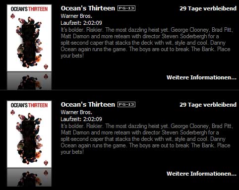 Das zweite Problem betrifft die Tatsache, dass der Film zur gleichen Zeit jeweils nur auf einem Gerät vorhanden sein darf. Allerdings, so versprach uns Steve Jobs, könne man den geliehenen Film auf jedes beliebige Gerät übertragen, um es dann dort weiter sehen zu können. Dies ist so allerdings nicht ganz korrekt. Man kann zwar den Film sowohl auf jeden beliebigen iPod, das Apple TV und auch auf das iPhone übertragen. Auf einen anderen Rechner ist dies jedoch nicht möglich. Sobald man dies nämlich versucht, erhält man die Fehlermeldung "Could not play the rented movie because it is authorized to play on another computer or device." Schlussendlich bedeutet dies, dass man sich den Film entweder auf einem iPod oder iPhone, dem Apple TV oder eben dem Rechner anschaut, auf dem man ihn heruntergeladen hat. Ein kleiner Trick schafft hier jedoch Abhilfe. So ist es möglich, den gemieteten Film vom Ursprungsrechner auf einen iPod oder ein iPhone zu übertragen, diesen dann an den anderen Rechner anzuschließen und ihn dort wiederum in dessen iTunes-Bibliothek zu übertragen. Dies funktioniert auch ohne die gesamte Bibliothek mit dem iPod zu synchronisieren. Achtung! Zum downloaden des gemieteten Films sollte immer die der Rechner mit der iTunes Hauptbibliothek verwendet werden, da zwar das Verschieben des Films vom iPod auf den anderen Rechner ohne Synchronisation der kompletten Bibliothek funktioniert, nicht aber das Verschieben vom Rechner auf den iPod.