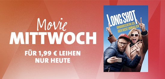 Auch heute hat Apple wieder den sogenannten "Movie Mittwoch" ausgerufen. Dabei wird jeden Mittwoch ein ausgewählter Film aus dem iTunes-Sortiment für 24 Stunden zum Sonderpreis von nur € 1,99 in HD-Qualität zum Leihen angeboten. Heute erhält man dabei die Blockbuster-Komödie Long Shot mit Seth Rogen in der Hauptrolle. Nachdem man den Leih-Film geladen hat, kann er innerhalb von 30 Tagen angeschauen werden. Wie immer bei geliehenen Filmen aus dem iTunes Store gilt: Hat man hiermit einmal begonnen, muss man ihn innerhalb von 48 Stunden beenden.