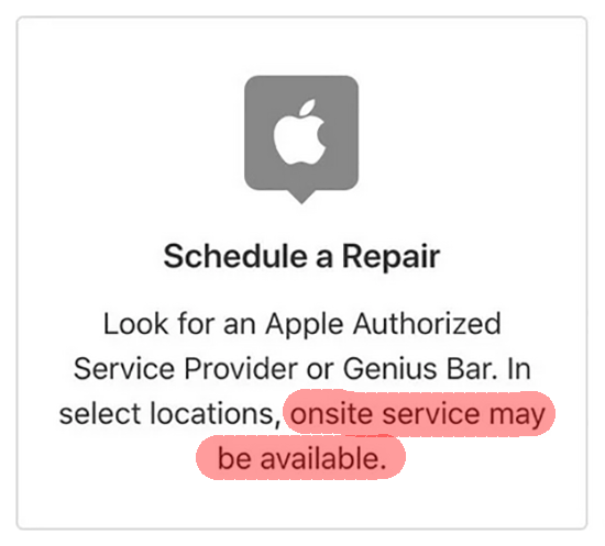 Besucht man Apples Support Webseiten um eine Reparatur zu initiieren, findet man in den USA nun neben der Apple Genius Bar und von Apple autorisierten Servicepartnern auch den Hinweis auf die Möglichkeit der "Onsite-Reparaturen". Hierzu arbeitet Apple unter anderem mit Go Tech Services als Partner zusammen. Ob das Angebot mittelfristig auch auf andere Regionen und Länder ausgeweitet wird, ist aktuell unklar.