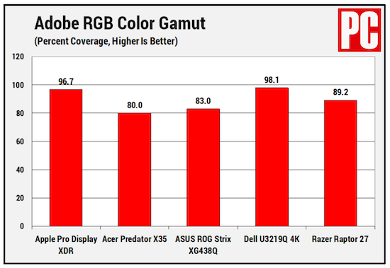 So erreicht das Pro Display HDR im Adobe RGB Frabraum-Test einen fast perfekten Wert von 96,7% und schlägt dabei seine Konkurrenten, den Acer Predator X35, den ASUS Rog Strix XG438Q, den Dell U3219Q 4K und den Razer Raptor 27 teils deutlich. Auch in einem DCI-P3 Farbraum-Test kann der Apple-Monitor mit 98,7% überzeugen und sich gegen die Konkurrenz durchsetzen.