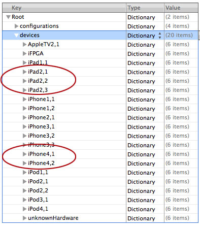 Doch das ist nicht alles, was entdeckt wurde. Engadget entdeckte erste eindeutige Referenzen auf das kommende iPhone und wohl das iPad 2. In den Tiefen von iOS 4.3 tauchen hierzu die bislang unbekannten Gerätenummern "iPad2,1", "iPad2,2", "iPad2,3", "iPhone4,1" und "iPhone4,2" auf. Aktuell sind die Nummern "iPad1,1" (erste iPad-Generation), "iPhone3,1" (GSM-iPhone) und "iPhone3,2" (CDMA-iPhone) für die aktuellen Geräte-Generationen im Umlauf. Wahrscheinlich ist daher die folgenede Zuordnung: "iPad2,1" (GSM-iPad 2), "iPad2,2" (CDMA-iPad 2), "iPad2,3" (???), "iPhone4,1" (GSM-iPhone 5) und "iPhone4,2" (CDMA-iPhone 5). Dies ist allerdings keine große Überraschung, da die Veröffentlichung des iPad 2 wohl recht kurz bevorsteht und auch die 5. iPhone-Generation guten Gewissens für den Sommer erwartet werden kann.
