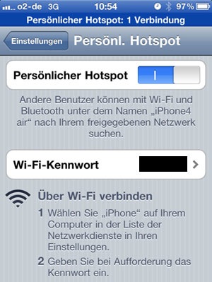 Der einmal konfigurierte Personal Hotspot stellt seine Datenverbindung übrigens über eine WPA2-geschützte WLAN-Verbindung an bis zu fünf Geräte zur Verfügung. Ein Leser des fscklog berichtet außerdem, dass es seit iOS 4.3 möglich ist, ein WiFi-only iPad auch über Bluetooth mit einem iPhone zu tethern.