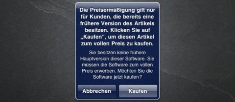 Der iPhone-Blog weist unterdessen auf eine mögliche Änderung hinsichtlich von App-Käufen hin. Versucht man eine mit einem anderen iTunes-Account erworbene App zu aktualisieren, schlägt einem statt der gewohnten Passwortabfrage der folgende Dialog entgegen, der ein zukünftiges "Upgrade-Pricing Modell" für Apps in den Bereich des möglichen rücken lässt.