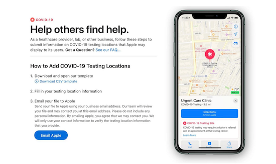 Apple treibt seine Maßnahmen zur Unterstützung bei der Eindämmung des Coronavirus weiter voran. So hat man inzwischen ein Onlineportal ins Leben gerufen, auf dem Gesundheitseinreichtungen, Krankenhäuser und Labore ihre Standorte für COVID-19 Test-Locations eintragen können. Die auf diese Weise erfassten Ergebnisse werden dann demnächst in Apples Karten-App ebenso zu finden sein, wie weiterführende Informationen zu der Testeinrichtung. Selbstverständlich werden die eingerichten Standorte vor der Veröffentlichung von Apples Karten-Team überprüft.