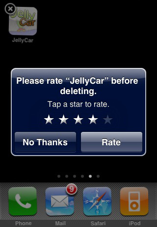 Seit der Nacht von Freitag auf Samstag steht Entwicklern die zweite Betaversion von iPhone OS 2.2 zur Verfügung. Trotz NDA, welches nach wie vor für Betaversionen gilt, gelangen immer wieder Neuigkeiten aus diesen Versionen an die Öffentlichkeit. So wurde bereits bekannt, dass Apple Mobile Safari überarbeiten wird, die Aktivität der Rechtschreibkorrektur dem Anwender überlässt und Wegbeschreibungen für Fußgänger, öffentliche Verkehrsmittel und das umstrittene Streetview in Google Maps integriert hat. Nun sickerten über verschiedene Foren weitere Neuerungen durch. Zum einen wird man nun aufgefordert, ein Programm zu bewerten, sobald man versucht es vom iPhone zu löschen (siehe Bild unten), zum anderen werden sich Anwender mit vielen Home-Bildschirmen freuen, dass man in Zukunft von jedem beliebigen Home-Bildschirm mit einem Druck auf die Home-Taste zum ersten Home-Bildschirm zurück gelangt. Wann Apple die neue Version für die Allgemeinheit veröffentlicht, steht bislang noch in den Sternen.