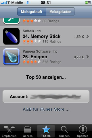 Mit der in der Nacht von Dienstag auf Mittwoch für registrierte Developer veröffentlichten vierten Beta von iPhone OS 3.0 hat Apple den ominösen neuen Menüeintrag "Store" in den Einstellungen mit Leben gefüllt. Diese neue Funktion der Verwaltung von iTunes Accounts auf dem Gerät selbst wirkt sich auch auf die mobilen Varianten des iTunes Store und des AppStore aus. Tauchte dort am Ende z.B. der Chartlisten lediglich eingraviert der jeweils aktive iTunes Account auf, so kann dieser inzwischen auch angeklickt werden. Daraufhin taucht dann ein Dialog auf, der es einem ermöglicht, die Account-Details einzusehen oder sich abzumelden. Hat man letzteres getan, besteht mit dem dann erscheinenden Anmelde-Button wiederum die Möglichkeit, ein Menü einzublenden, welches dieses Mal die Möglichkeit bietet, sich mit einem vorhandenen iTunes Account anzumelden, oder einen neuen Account zu erstellen. Somit sollte in Zukunft die komplette Verwaltung der eigenen iTunes Accounts möglich sein. Ein Klick auf die folgenden Screenshots vergrößert diese.