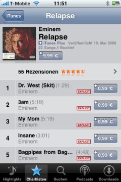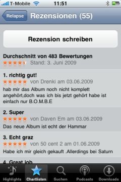 Der mobile iTunes Store ist spätestens seit der eingeführten Möglichkeit, auch über das Mobilfunknetz Titel laden zu können ein tolle Marktplatz für Musikliebhaber. Was bislang gefehlt hat ist jedoch die Möglichkeit, von unterwegs Rezensionen für seine Lieblingsmusik abgeben zu können. Dies gehört ab iPhone OS 3.0 der Vergangenheit an. In der aktuellen Beta steht diese Option nämlich nun endlich zur Verfügung. Vom mobilen AppStore schon länger bekannt, können also auch im mobilen iTunes nun Rezensionen abgegeben und bereits vorhandene gelesen werden. Weiter auf sich warten lässt hingegen der mobile Film-Download, wenngleich die entsprechenden Inhalte schon verfügbar sind, landet man mit einem Tap auf einen Film nach wie vor im Nirvana. Abschließend noch zwei Screenshots aus den Musikrezensionen.