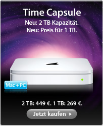 Was früher der Dienstag war scheint nun immer mehr der Donnerstag zu werden. Der Tag, an dem Apple neue Produkte in den Apple Store aufnimmt. Waren es in der vergangenen Woche noch die neuen Versionen von Logic Studio und Final Cut Studio, so führt der amerikanische Apple Store seit kurzem ein Update für die Netzwerkspeicherlösung Time Capsule. War das Gerät bislang in Kapazitäten von 500 GB und 1 TB erhältlich, so bietet Apple die Time Capsule nun in den Größen 1 TB und 2 TB an. Die Preise bleiben dabei unverändert. Die kleine Ausführung kostet $299,- und die Größere $499,-. Auch im deutschen Online-Store ist das Update bislang noch nicht inzwischen aufgetaucht. Auch hier bleiben die Preise unverändert bei € 269,- für das kleinere 1 TZB-Modell und € 449,- für die 2 TB Variante.