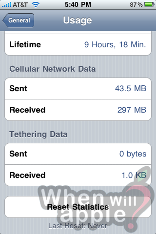 UPDATE: Laut WhenWillApple ist es ab sofort möglich, Videos per Copy & Paste in E-Mails zu kopieren, um sie auf diese Weise, genau wie es bislang auch bei Fotos möglich war, in voller Auflösung verschicken zu können. In den Einstellungen kann man zudem seine verbrauchten Tethering-Daten abfragen (siehe Screenshot) und das iPhone vibriert nun nicht mehr, wenn man die Icons auf dem Springboard bearbeiten möchte.