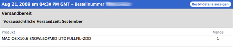 Beinahe täglich tauchen inzwischen Meldungen auf, die es immer wahrscheinlicher erscheinen lassen, dass Mac OS X a.k.a. "Snow Leopard" tatsächlich am kommenden Freitag, den 28. August offiziell in den Handel gelangt. Nun hat sich auch bei meiner Bestellung von Snow Leopard über das Up-To-Date-Programm etwas getan. Zwar steht die voraussichtliche Versandzeit nach wie vor auf September, jedoch hat sich der Status von "Noch nicht versendet" auf "Versandbereit" geändert, was auf eine baldige Auslieferung schließen lässt. Darüber hinaus will einem Bericht zufolge ein Japaner als Installations-Medium zu seinem am 20. August ausgelieferten Mac mini eine Snow Leopard DVD erhalten haben. Fotos der DVD und des Snow Leopard Installers sind bei den Kollegen von MacRumors zu sehen. Nach wie vor fehlt jedoch die offizielle Ankündigung von Apple. Diese könnte der Apple-Tradition folgend am kommenden Dienstag folgen.