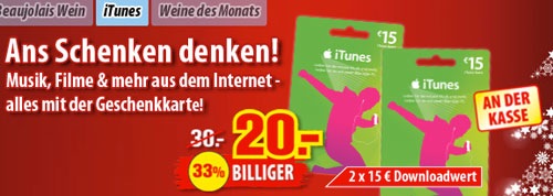 Erst der Media Markt, dann MediMax und nun der Lebensmitteldiscounter Penny. Aktionen bei denen iTunes Wertkarten zu günstigeren Preisen zu verramscht werden haben anscheinend aktuell Konjunktur. Vom heutigen Montag an werden im Rahmen einer Aktion unter anderem Karten für den Einkauf im iTunes Store zu einem vergünstigten Preis angeboten. Aktuell kosten dort zwei iTunes-Karten mit einem Guthaben von € 15,- zusammen nur € 20,- anstatt der ansonsten fälligen € 30,-. Man spart auf diesem Wege also satte € 10,-! Das Guthaben kann nach Eingabe des Gutscheincodes jedoch natürlich in voller Höhe nach Herzenslust zum Einkauf von Musik, Videos und Apps im AppStore genutzt werden. Aber Achtung, die Aktion mit den iTunes-Karten gilt lediglich bis zum 20. November. Also, rechtzeitig zuschlagen, schließlich haben die Karten ja kein Verfallsdatum! (Danke an alle Tippgeber!)