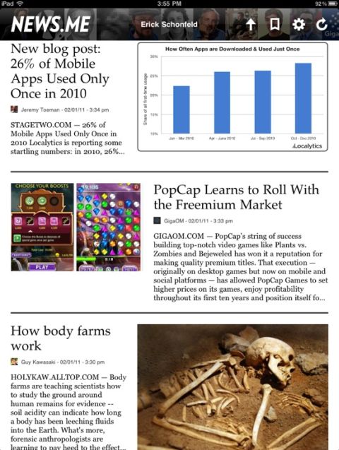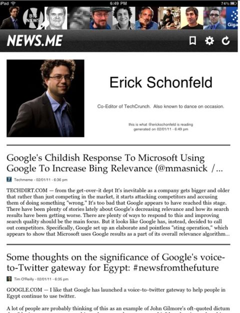 Die Vorstellung von "The Daily" liegt gerade mal ein paar Stunden hinter uns, da bahnt sich schon die nächste News-App für das iPad an. Und dahinter steckt niemand geringeres als die altehrwürdige New York Times. Der Name des Projekts lautet "News.me" und soll sich vom Ansatz her komplett von "The Daily" unterscheiden. News.me soll eine "Social News"-App werden, die hauptsächlich die Nachrichten präsentiert, die Leute, denen man bei Twitter folgt, lesen. Viel gelesene Nachrichten landen entsprechend höher im Wichtigkeitsranking der App und werden somit auch prominenter platziert. Dabei werden aber nicht nur Daten von Twitter genutzt, sondern auch vom Link-Verkürzer