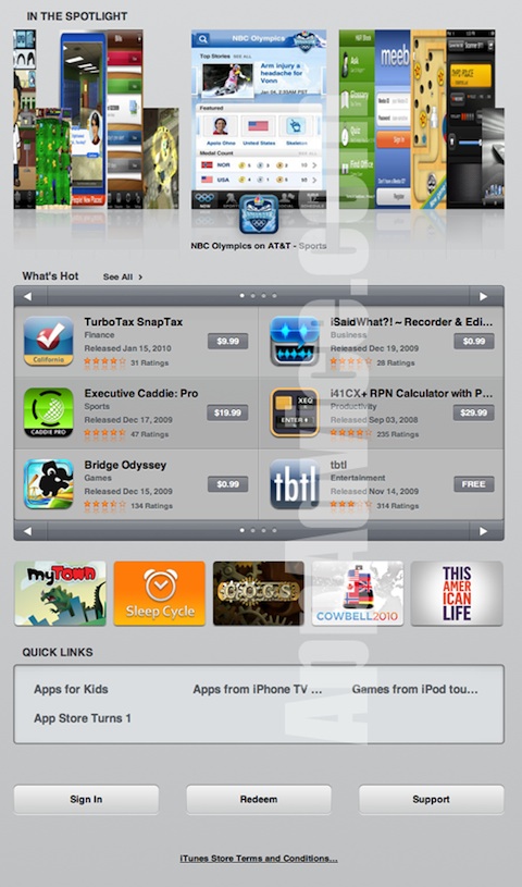 Die Kollegen von AppAdvice gewähren eine knappe Woche vor dem Verkaufsstart des iPad in den USA und damit auch dem Start des iPad AppStore einen ersten Blick in selbigen. Keine Ahnung wie sie das geschafft haben, aber die Screenshots sehen vielversprechend aus. Wie zu erwarten war, ist der Store komplett neu an das iPad abgepasst worden. Sofort ins Auge fällt dabei die prominente Platzierung der primären Screenshots der Apps in CoverFlow-Ansicht. Ansonsten gibt es Vieles, was man auch schon vom "herkömmlichen" AppStore kennt: "What’s hot", "In the Spotlight" und "Featured". Zukünftig werden App in die beiden Kategorien "Apps" (für alle Geräte mit iPhone OS) und "iPad Apps" (nur für das iPad) unterschieden. Nach wie vor sorgt die (noch nicht endgültige!) Preisgestaltung im iPad AppStore für Diskussionen im Internet. Es muss sicherlich abgewartet werden, ob sich die Preisstruktur hier ähnlich in Richtung unteres Ende entwickelt, wie es auch beim klassischen AppStore der Fall war. Ich bin jedoch nach wie vor der Meinung, dass Qualität durchaus seinen Preis haben darf. Abschließend noch ein Screenshot, weitere gibt es bei den Kollegen von AppAdvice.