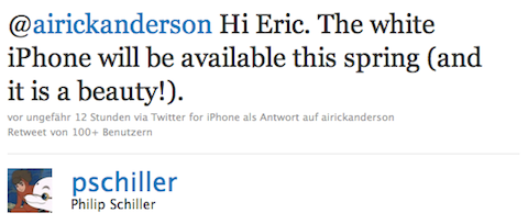 Manch einer glaubt schon gar nicht mehr daran, andere warten nach wie vor sehnsüchtig darauf. Die Rede ist vom weißen iPhone 4. Auf der WWDC 2010 vollmundig angekündigt, wurde der Verkaufsstart wieder und wieder verschoben. Als letztes offizielles Statement gab Apple das Frühjahr 2011 als Starttermin aus. In der vergangenen Nacht nun war es Apples Marketing-Chef Phil Schiller, der dies per Twitter noch einmal bestätigte. Dort schreibt er: The white iPhone will be availabe this spring (and it is a beauty!)". Zuletzt war es ein Apple-Analyst, der einen Verkaufsstart Anfang April prognostizierte. Fakt ist, dass das Frühjahr nicht mehr allzu lange dauert und Apple vermutlich Anfang April sein iOS 5 Preview-Event abhalten wird. Eine Ankündigung anlässlich dieses Events. Eine Ankündigung