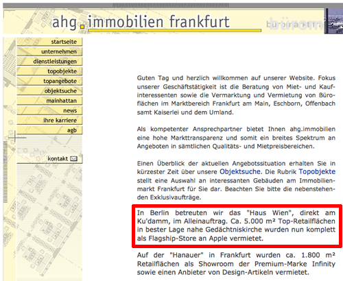 Dass Apple eine Retail Store in Berlin planen dürfte, gilt inzwischen als unbestritten. Spekulationen hierzu gab es erstmals im Januar. Bislang unbestätigten Gerüchten zufolge soll es sich bei den aktuell stattfindenden Umbauarbeiten in der ehemaligen "Filmbühne Wien" am Ku’damm 26 um die Renovierung für eben diesen Hauptstadt-Store handeln. Mitte Mai gab es bereits Berichte, wonach der Innenausbau schon weitgehend abgeschlossen sei, so dass unter anderem bereits Kabel und Anschlüsse verlegt sind. Selbst die obligatorische schwarze Verhüllung der ebenfalls bereits verglasten Front hat inzwischen stattgefunden. In der Regel vergeht nach diesem Akt nicht mehr allzu viel Zeit bis zur Eröffnung eines Stores. Allerdings taucht ein Berliner Store bislang noch mit keinem Sterbenswörtchen in Apples Stellenanzeigen auf. In der Vergangenheit waren es vor allem diese Stellenbeschreibungen, die einen Apple Store mehr oder weniger offiziell ankündigten. Im Fall von Berlin prescht nun der für die Location zuständige Immobilienmakler, ahg immobilien frankfurt, hervor und schreibt auf seiner Webseite: "In Berlin betreuten wir das "Haus Wien", direkt am Ku’damm, im Alleinauftrag. Ca. 5.000 m² Top-Retailflächen in bester Lage nahe Gedächtniskirche wurden nun komplett als Flagship-Store an Apple vermietet." Während ein Termin für die Eröffnung weiter ungewiss ist, dürfte Apple sicherlich nicht besonders begeistert über die "offizielle" Bestätigung der Location durch Dritte sein...