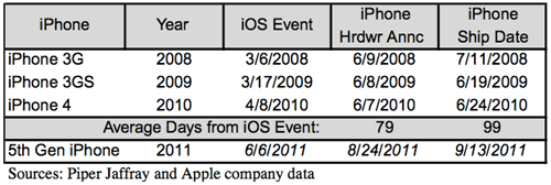 Sieht man einmal davon ab, dass sich Apple in der Regel eher wenig um statistische Werte kümmert, ist die von Piper Jaffrays veröffentlichte Grafik als durchaus interessant zu bewerten. Ein iPhone-Zulieferer hat den Analysten gegenüber angegeben, dass Apples Bestellungen für iPhone-Komponenten in diesem Jahr deutlich später eingetroffen seien, als in den vergangenen Jahren. Auch Gene Munster pflichtet inzwischen einem Zeitrahmen um den Herbst herum bei. Errechnet man sich auf Basis statistischer Werte die Zeit zwischen iOS-Event, Hardware-Ankündigung und iPhone-Verfügbarkeit, kommt man erneut auf den ohnehin schon weit verbreiteten September als Verkaufsstart für die nächste iPhone-Generation. Dies setzt natürlich voraus, dass die allgemeine Deutung des WWDC Mottos "Join us for a preview of the future of iOS and Mac OS X." tatsächlich die Vorstellung samt Veröffentlichung der Developer Preview von iOS 5 in knapp gut Wochen beinhaltet. Basierend auf den Daten der vergangenen Jahre könnte dann eine Präsentation des iPhone 5 Ende August erfolgen, ein Verkaufsstart Mitte September (siehe Tabelle unten). Laut Munster macht ein Verkaufsstart im September auch aus bilanztechnischer Sicht Sinn, schließlich hat der Verkaufsstart im Sommer ohnehin größtenteils die Bilanz in Apples September-Quartal beeinflusst. Hinsichtlich der neuen Funktionen glaubt Munster, dass diese in erster Linie softwarebasiert seien und auf iOS 5 basieren werden. Hinzu kommt ein 4"-Display "bis spätestens 2012, wahrscheinlich aber schon 2011", während LTE-Unterstützung erst im iPhone 6 zu erwarten sei. Als Grund für den später als üblichen Verkaufsstart führt Munster dann auch die möglichen neuen iOS-Funktionen an, die evtl. noch nicht ganz fertig sind. Würde dem so sein, könnte Apple folgende iPhone-Generationen auch durchaus wieder im Sommer präsentieren. (via AppleInsider)