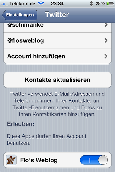 Wie auf dem Event angekündigt, hat Apple soeben damit begonnen, den GM-Build (9A334) von iOS 5 an seine Entwickler zu verteilen. In der Regel ist dies der Build, der letztlich auch als finale Version die Geräte der User erreicht, vorausgesetzt, es werden keine gravierenden Probleme mehr mit dieser Version festgestellt. Damit biegt Apple dann auch auf die Zielgerade der Betaphase von iOS 5 und iCloud ein. Bereits am Wochenende hatte Apple eine weitere Beta des wohl ebenfalls für iCloud benötigten OS X 10.7.2 veröffentlicht, bei der es sich ebenfalls um den GM handeln dürfte. Heute nun folgte auch hiervon der GM Build (11C73), der ab sofort über die Developer Connection geladen werden kann. Neuerungen sind aus dem iOS 5 GM bislang nicht bekannt. Bereits in der vorherigen Version enthalten, bislang aber (zumindest von mir) noch unentdeckt, befindet sich eine Twitter-Einstellung, über die entsprechend angepassten Apps der Zugriff auf den ab iOS 5 systemweit integrierten Dienst gewährt und auch wieder entzogen werden kann.
