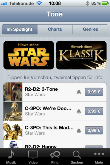 Dass dieser Tag kommen würde, war spätestens seit der ersten Betaversion von iOS 5 zu hoffen. Dennoch war die Wartezeit ungewöhnlich lang. Ab sofort können nun jedoch, quasi als weiterer Vorbote für die heute noch anstehenden Neuerungen, auch hierzulande zusätzliche Klingeltöne aus dem iTunes Store erworben werden. Zu erreichen ist die Rubrik über den mobilen iTunes-Store. Unter der Rubrik "Töne" (zu erreichen über den Tab "Mehr") werden dabei die zusätzlichen Klingeltöne zum Stückpreis von € 0,99 angeboten. Unter iOS 5 lässt sich dieser Bereich auch über die Einstellungen und dann unter Töne aufrufen. Ganz oben in den Rubriken "Klingelton" bzw. "SMS-Ton" gelangt man dann in zu den Kaufangeboten, die sich aktuell vornehmlich aus Sounds aus den Star Wars Filmen zusammenstellen. In iTunes auf dem Rechner konnte ich die entsprechende Kategorie bislang noch nicht ausfindig machen.
