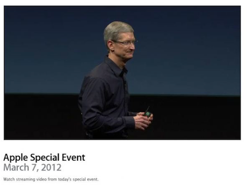 Apples "We have something you really have to see. And touch."-Event ist bereits Geschichte und man kann mit den Neuvorstellungen aus meiner Sicht durchaus zufrieden sein. Dabei haben sich viele der im Vorfeld gehandelten Gerüchte bewahrheitet und Apple hat neben dem neuen iPad und einem neuen HD-fähigen Apple TV auch das nächste iOS-Update auf Version 5.1 veröffentlicht. Inzwischen ist es auch möglich, sich die Veranstaltung und damit auch die Vorstellung der neuen Produkte in bewegten Bildern anzuschauen. Hierfür steht auf den Apple-Servern der Mitschnitt der Keynote als QuickTime-Stream bereit. Ein Klick auf das Bild unten führt direkt zum Keynote-Stream. In Kürze dürfte der Mitschnitt zudem auch als Podcast über iTunes bereit stehen. (danke an alle Tippgeber!)