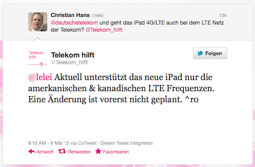 UPDATE: Und hier nochmal offiziell. Via Twitter bestätigt die Telekom, dass LTE in ihrem Netz mit dem neuen iPad nicht genutzt werden kann. (nochmal danke, Cromax!)