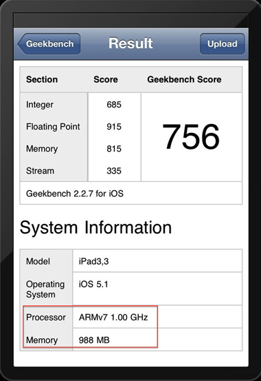 Deutlich interessanter ist da schon die Erkenntnis, die man aus einem durchgeführten Geekbench-Test gewonnen hat. Demnach verfügt das neue iPad in der Tat wie bereits vermutet über nun einen satten ganzen Gigabyte Arbeitsspeicher und damit doppelt so viel wie sein Vorgänger. Der Prozessor des verbauten A5X-Chips verharrt hingegen wie beim iPad 2 bei 1 GHz. Demzufolge hat sich Apple bei dem gepimpten neuen Chip voll und ganz auf die Optimierung der nun 4x schnelleren Grafikleistung konzentriert. Insgesamt bringt es das neue iPad auf einen Geekbench-Score von 756 Punkten. Zum Vergleich: Das iPad 2 kommt bei mir auf 761 Punkte, das iPhone 4S auf 629 Punkte. Die Ähnlichkeit zwischen dem neuen iPad und dem iPad 2 war zu ewarten, testet der Geekbenchtest doch lediglich die Performance von RAM und CPU.