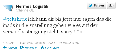 Und zur Beruhigung der Hermes-Kandidaten sei gesagt, dass man sich dort vie Twitter alle Mühe gibt, die Gemüter zu beruhigen und darauf verweist, dass das Gerät zu dem Termin geliefert wird, der "auf der Versandbestätigung steht". Zudem sollte man davon ausgehen, dass sich Hermes alle Mühe geben wird, seinen Einstand als Apple-Lieferant nicht komplett zu verbocken. Und in der Tat erreichten mich auch schon am heutigen Morgen die ersten Meldungen, wonach das Tracking beginnt zu klappen.