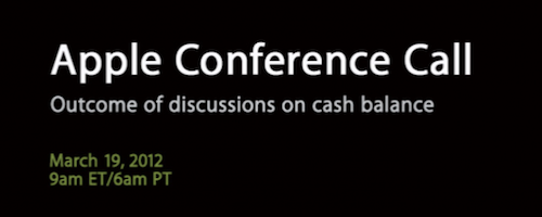 Überraschend hat Apple für den heutigen Montag einen Conference Call angekündigt, auf dem Apple CEO Tim Cook und der Finanzchef des Unternehmens, Peter Oppenheimer, Neuigkeiten zum Barvermögen Apples bekannt geben werden: "Tim Cook, Apple’s CEO, and Peter Oppenheimer, Apple’s CFO, will host a conference call to announce the outcome of the Company’s discussions concerning its cash balance. Apple will not be providing an update on the current quarter nor will any topics be discussed other than cash."
