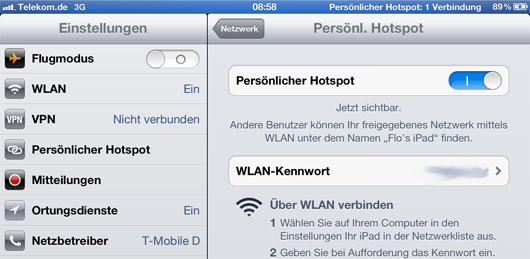 Nach ein paar Tests kann ich nun aber bestätigen, dass sich auch die aktuellen Netzbetreiber-Einstellungen für das iPhone auf dem neuen iPad nutzen lassen. Und siehe da - plötzlich funktioniert auch auf dem Tablet der Personal Hotspot! Hierzu sind lediglich ein paar Maßnahmen zu treffen, die ich im folgenden beschreiben werde. Vorab jedoch noch eine Warnung: Diese Vorgehensweise ist weder von der Telekom, noch von Apple so gewünscht. Sollten Probleme auftreten, könnte dies unter Umständen dazu führen, dass das iPad komplett zurückgesetzt werden muss. Legt daher vorher in jedem Fall ein aktuelles Backup an! Hier nun die Anleitung: