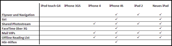 Mit der Vorstellung von iOS 6 auf der WWDC-Keynote war auch klar, welche Geräte von dem neuen Betriebssystem ab Herbst unterstützt werden. Hierunter fallen das iPhone 3GS, das iPhone 4, das iPhone 4S, das iPad 2 und das neue iPad, sowie der iPod touch der vierten Generation. Doch wie es auch in der Vergangenheit schon war, wird Apple nicht den kompletten Funktionsumfang von iOS 6 auch auf all diese Geräte bringen. In den vergangenen Stunden seit der Keynote erreichten mich zahlreiche Mails, in denen User fragten, welche Funktion denn nun auf welchem Gerät unterstützt wird. Ein Blick in das Kleingedruckte auf Apples Webseiten zu iOS 6 schafft hier Abhilfe. Dabei wird relativ schnell deutlich, dass iOS 6 zwar auf dem iPhone 3GS läuft, aber nur die wenigsten neuen Funktionen unterstützt. Ähnliches gilt für den iPod touch der vierten Generation, auch wenn hier nicht eindeutig zu erkennen ist, ob Apple ihn in seinen Anmerkungen mit dem iPhone 4 gleichsetzt. Die folgende Tabelle gibt eine Übersicht über alle