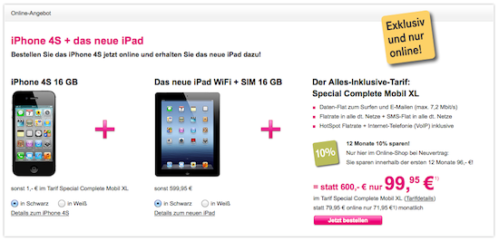 Hat da draußen noch jemand Bedarf an einem iPhone 4S oder einem neuen iPad? In diesem Fall dürfte das aktuelle Angebot der Telekom durchaus einen Blick wert sein. Dort gibt es momentan ein Bundle-Angebot, in dem man diese beiden Geräte zusammen für nur € 99,95 bei Online-Abschluss eines Vertrages im Tarif "Special Complete Mobil XL" erhält. Sowohl beim iPhone 4S, als auch beim iPad handelt es sich um die Variante mit 16 GB Speicher. Bei beiden Geräten hat man die Wahl zwischen den Farben schwarz und weiß. Das iPad kommt in der Variante WiFi+Cellular, also inkl. der Surfmöglichkeit über das Mobilfunknetz. Mit einer MultiSIM lassen sich dabei beide Geräte über ein und den selben Tarif nutzen.